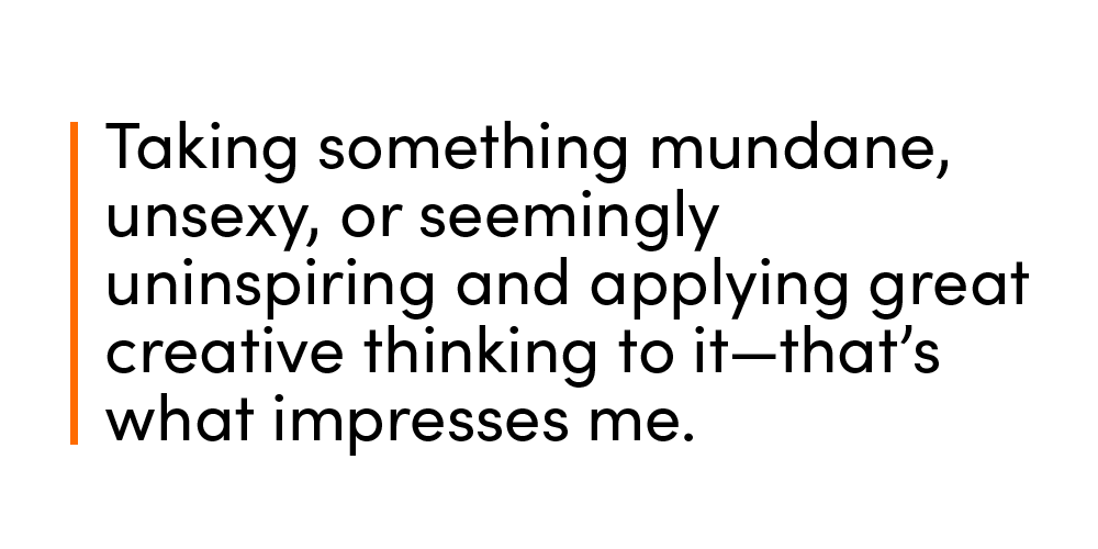 Taking something mundane, unsexy, or seemingly uninspiring and applying great creative thinking to it—that’s what impresses me. Sure, I’d love to work on Nike. But in some ways, it’s probably easier to create an ad for Nike than it is for chest drainage. The challenge is finding a way to differentiate something in the market that doesn’t naturally lend itself to excitement. That’s the real challenge.